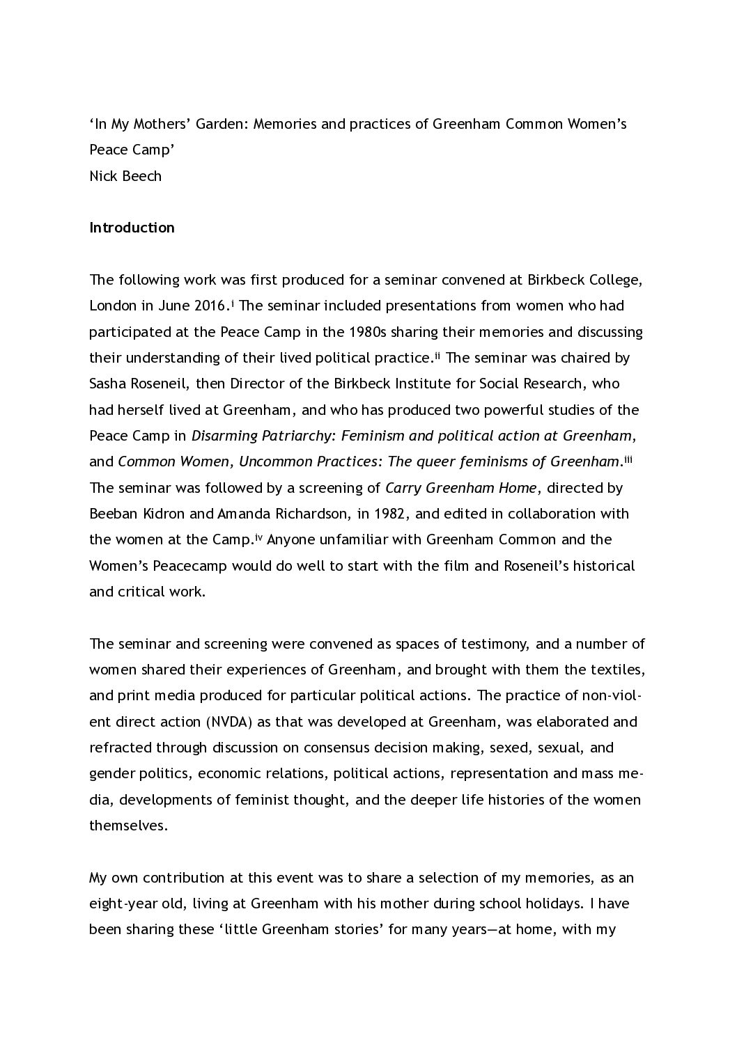 In My Mothers’ Garden: Memories and practices of Greenham Common Women’s Peace Camp (2016) Nicholas Beech ‘In My Mothers’ Garden